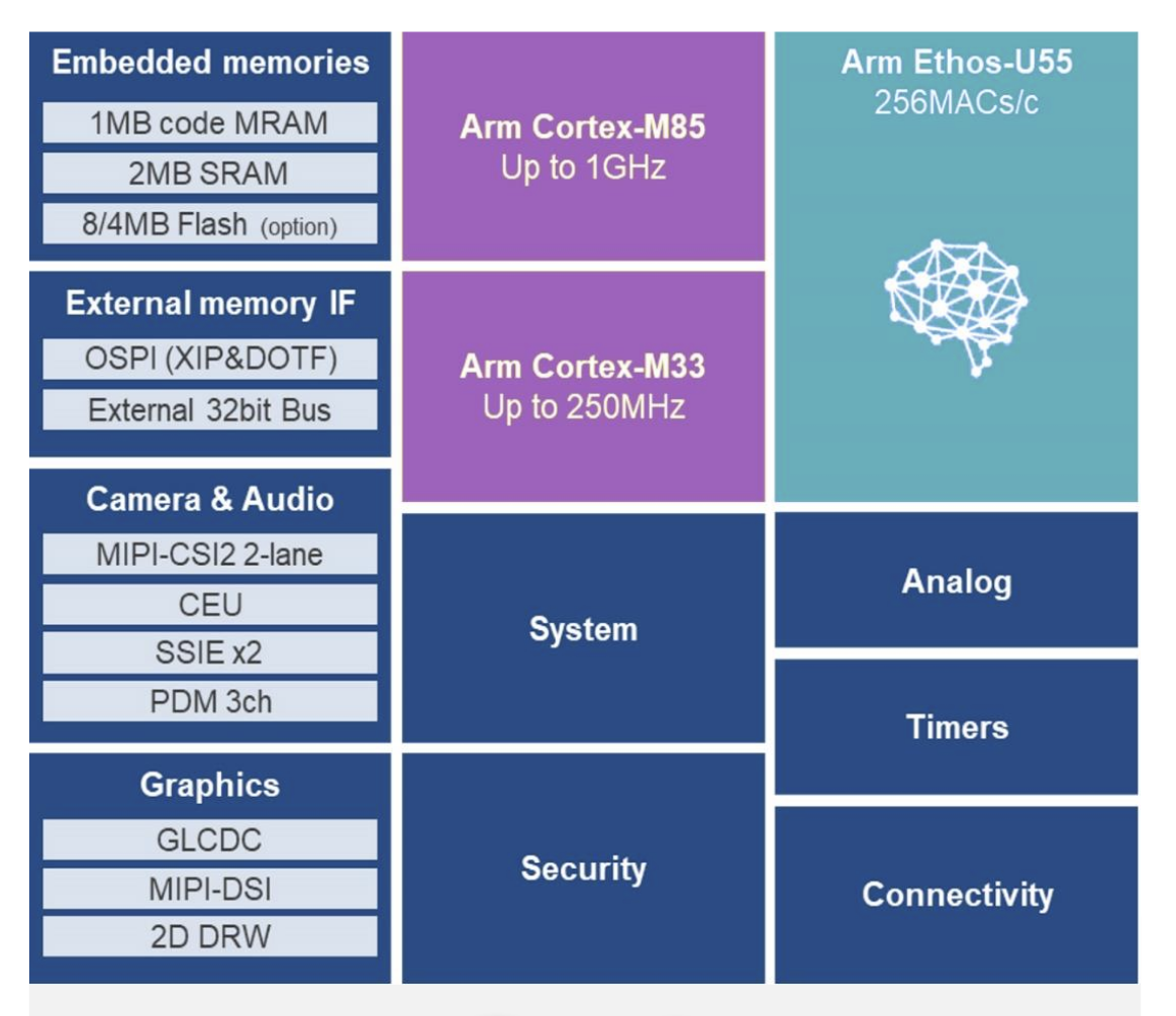 Toujours le seul fabricant de microcontrôleurs à avoir ajouté à son catalogue des modèles 32 bits bâtis sur le cœur Arm Cortex-M85, à notre connaissance, le japonais Renesas apporte aujourd’hui les performances de ce coeur de processeur à sa série des microcontrôleurs RA, avec le modèle RA8P1, en l’associant cette fois-ci à un coeur Cortex-M33 cadencé à 250 MHz et à une unité de traitement neuronal (NPU, Neural Processor Unit) Ethos-U55 d’Arm.