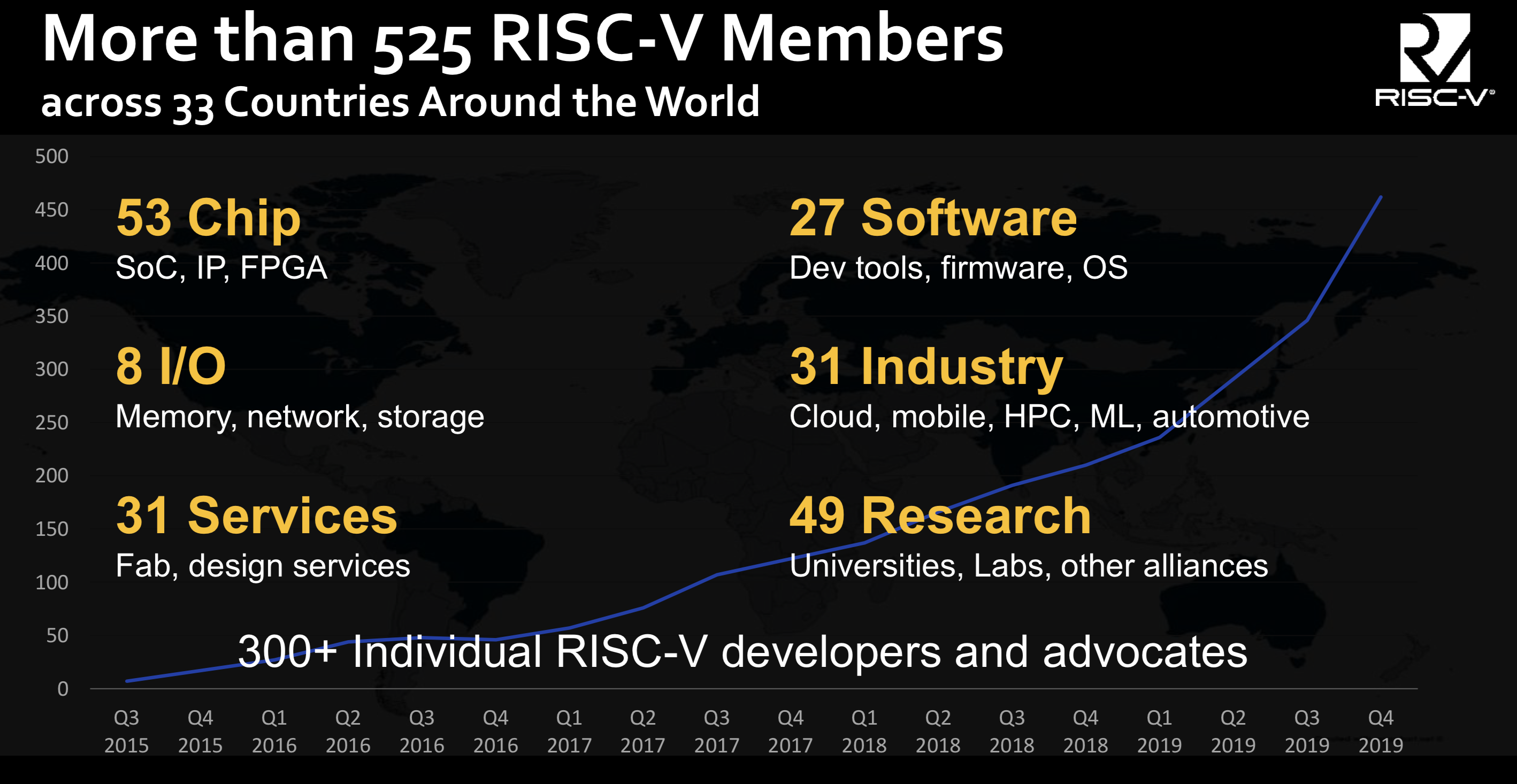 Avec désormais plus de 500 membres issus de 33 pays, la Fondation RISC-V est le reflet de l’intérêt croissant à travers le monde pour l'approche ouverte proposée par le jeu d’instructions en accès libre ISA RISC-V. Ainsi, l'écosystème RISC-V devrait croître de manière significative au cours des cinq prochaines années, une étude de Semico Research indiquant que le marché pourrait consommer un total de 62,4 milliards de cœurs d'unité centrale de traitement RISC-V d'ici à 2025, le secteur industriel devant être le marché le plus actif avec 16,7 milliards de cœurs (*).