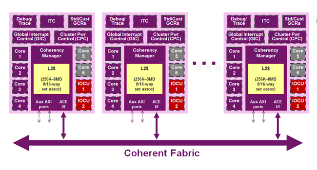 Mais l’hétérogénéité « outside » est aussi possible via la combinaison, dans un même SoC, de clusters de calcul basés sur des cœurs I6500, de GPU PowerVR ou d’autres types d’accélérateurs, le tout relié via un « réseau sur une puce » compatible ACE tel que ceux fournis par des sociétés comme Arteris ou NetSpeed. Selon Imagination, jusqu’à 64 clusters de six cœurs (avec quatre threads par cœur) peuvent ainsi être implémentés dans un même circuit intégré.