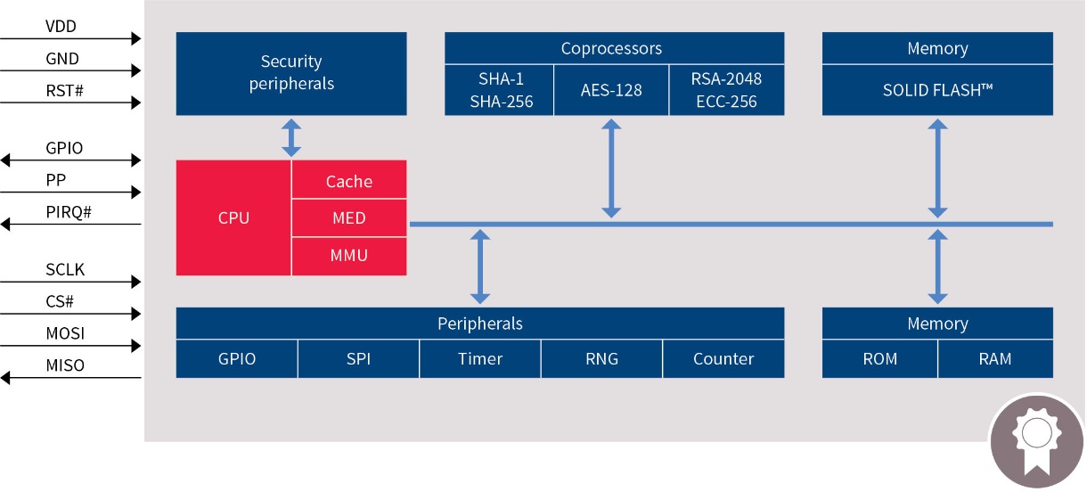 Apte à fonctionner dans la gamme de température comprise entre -40°C et +105°C, la puce obéit aux spécifications TPM 2.0 du Trusted Computing Group et a été certifiée par un laboratoire de test indépendant au niveau EAL4+ des Critères communs de sécurité.