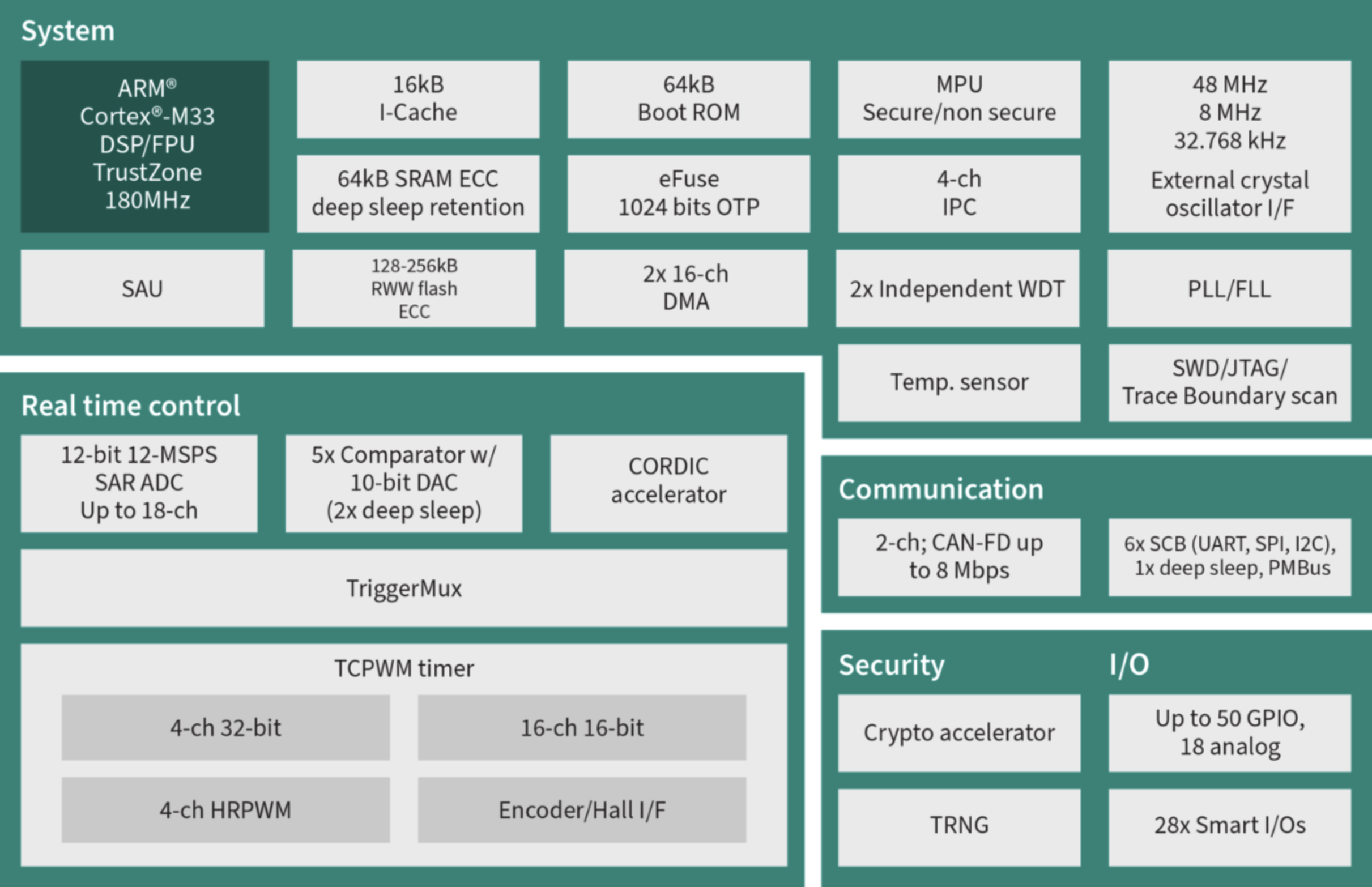 Les microcontrôleurs PSoC Control C3 permettent dans le détail de contrôler en temps réel les systèmes qui doivent répondre à des événements déterministes. Architecturés autour du puissant cœur de processeur Arm Cortex-M33, ces circuits fonctionnent jusqu'à 180 MHz et intègrent un processeur de signal numérique (DSP), une unité à virgule flottante (FPU) et le sous-système CORDIC (Coordinate Rotation Digital Computer), un accélérateur matériel pour les fonctions mathématiques qui a pour vocation d'accélérer les calculs de boucle de contrôle.