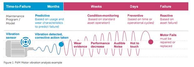 - Dans un second temps, il faut identifier les sources de données prioritaires ; l’intensification de la connectivité des actifs et l’utilisation d’objets connectés tendent à produire de gros volumes de données. Il n’est ni nécessaire ni recommandé d’analyser tous ces champs de données. Commencez plutôt par prévoir les défaillances possibles d’un actif en particulier et concentrez-vous sur les sources de données utilisables spécifiquement en rapport. La figure ci-dessus, donnant l’exemple d’analyse des vibrations d’un moteur selon l’approche PdM illustre comment, en collectant les données d’un capteur en temps réel, il est possible d’éviter des dommages coûteux, des temps d’arrêt et des interventions en urgence.
