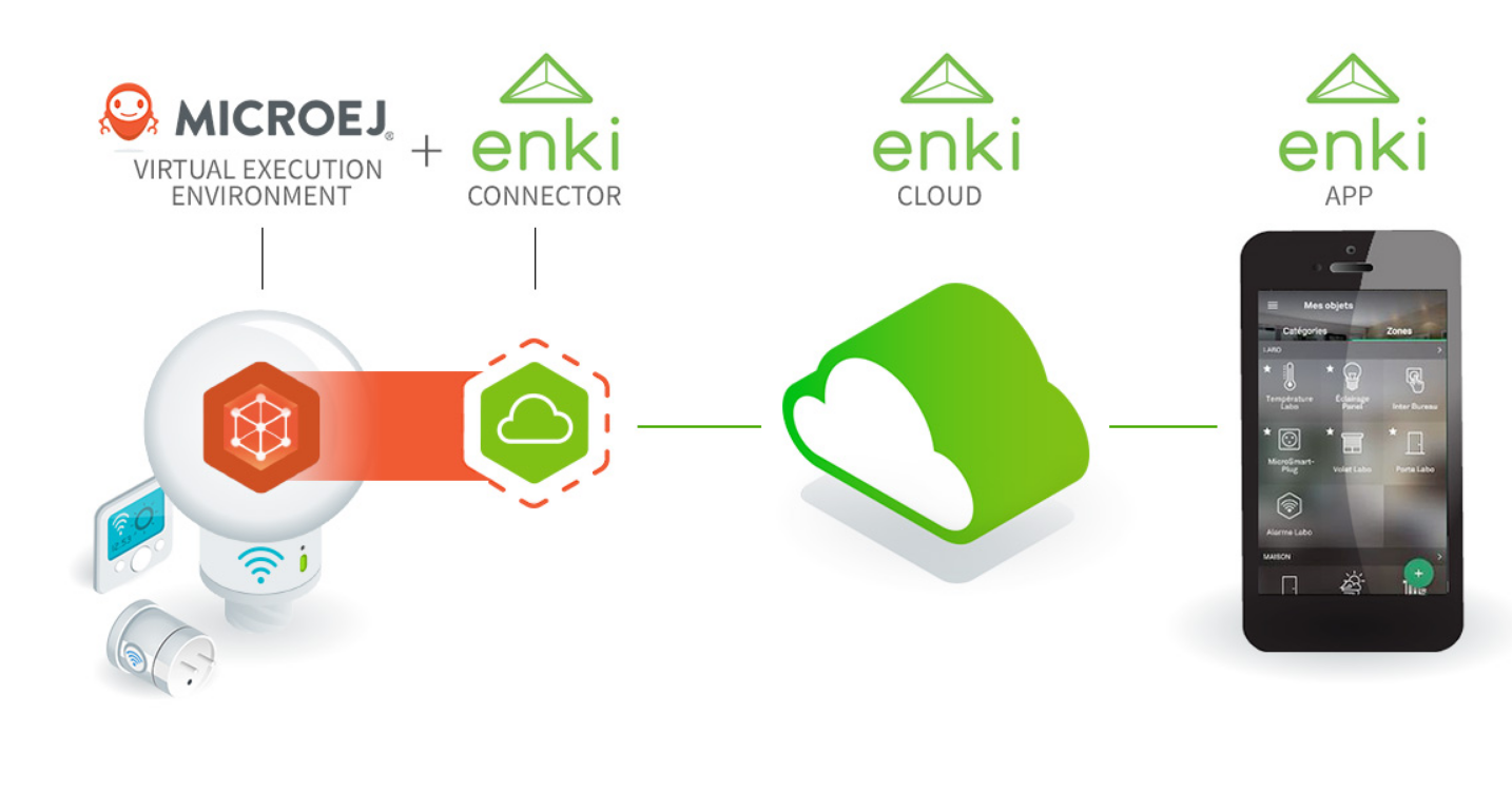 Pour faciliter l’intégration de ces objets connectés hétérogènes dans son écosystème, Enki utilise la technologie de MicroEJ pour créer un composant logiciel prêt à l’emploi qui assure la connexion de n’importe quel objet équipé d’une interface Wi-Fi à un environnement dans le cloud lié à la box Enki. En d’autres termes, cette application logicielle intègre de manière transparente la technologie propre à Enki et diminue le temps nécessaire à l’intégration de nouveaux objets dans l’écosystème Enki