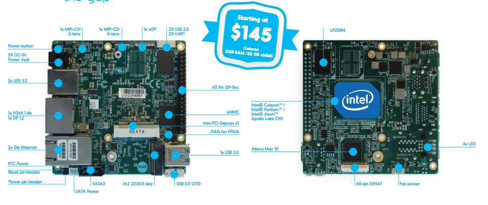 Quant à la UP2, lancée en 2016, elle était bâtie jusque-là autour d'un processeur Celeron N3350 double cœur ou d’un Pentium N4200 quadricœur (architecture Apollo Lake). Apte à l’exécution des systèmes d’exploitation Windows 10 IoT Core, ubilinux/Debian, Yocto, Ubuntu et Android Marshmallow, la UP Squared est dotée d'une mémoire LPDDR4 allant de 2 à 8 Go et de 128 Go de mémoire de stockage eMMC. La carte intègre en outre un processeur graphique GPU Intel Gen9 capable de prend en charge les codecs 4K. La carte comporte également quatre ports USB 3.0 et deux ports USB 2.0 associés à des interfaces CSI, HDMI, DP et eDP (embedded DisplayPort), ainsi qu'un port généraliste GPIO à 40 broches pour des extensions.
