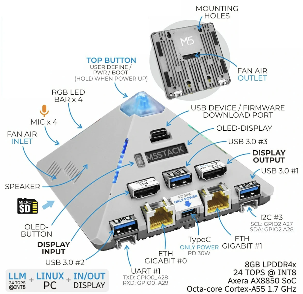 La firme chinoise M5Stack (détenue majoritairement depuis 2024 par son compatriote concepteur de microntrôleurs Espressif) lance une plateforme embarquée dotée d'un système de calcul en périphérie de réseau, dont une des originalités est de se présente sous une forme pyramidale.