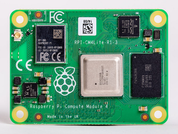 Le CM4 est un module processeur (SoM) fondé sur l’architecture du calculateur monocarte Raspberry Pi modèle 4B, avec comme processeur le CPU 64 bits Broadcom BCM2711 à quatre cœurs Arm Cortex-A72 cadencés à 1,5 GHz. Avec un facteur de forme mis à jour (55 × 40 × 4,7 mm), le CM4 prend en charge de nouvelles interfaces tels un double port HDMI pour la partie vidéo, un lien PCIe et un port Gigabit Ethernet compatible PoE (Power over Ethernet), avec toutefois la nécessité d’installer une carte fille HAT PoE séparée. Deux prises USB 2.0 et une prise micro-USB pour la mise à jour logicielle du CM4, et un emplacement pour carte micro-SD complètent l’ensemble qui, d’un point de vue physique, est installé sur une carte d’E/S autonome, commercialisée en tant que telle (photo ci-contre).