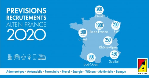Industrie 4.0, Big Data, véhicules autonomes, villes intelligentes, cybersécurité. Autant de domaines en développement au fort contenu technologique qui poussent le groupe d’ingénierie et de conseil en technologies Alten à recruter 4 400 postes en CDI sur toute la France en 2020. ...Soit, dans le détail, 4 000 ingénieurs, 260 Business Managers pour des fonctions commerciales et 140 cadres pour les fonctions support.