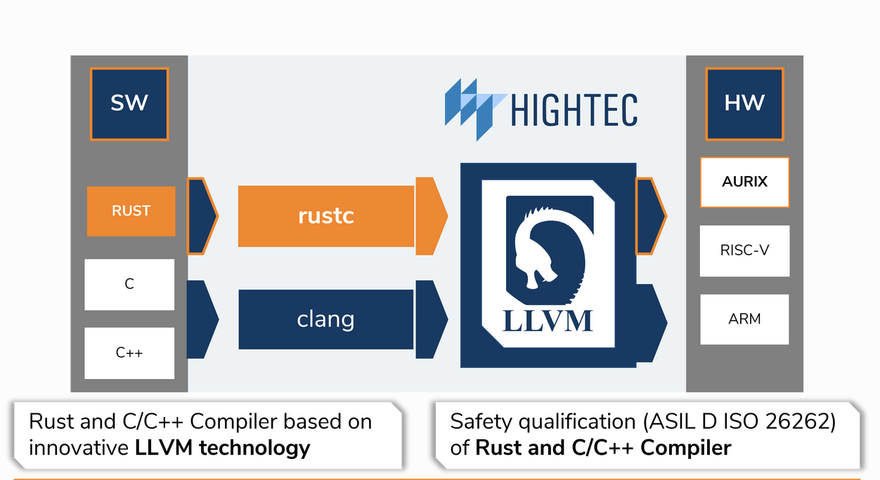 Au-delà, l’étape pionnière de HighTec est d’avoir qualifié son compilateur Rust, construit sur le logiciel open source LLVM (Low Level Virtual Machine), au niveau Asil-D selon la norme ISO 26262 pour les microcontrôleurs Aurix. Cette chaîne d'outils unifiée permet, selon HighTec, une intégration transparente du code Rust nouvellement développé avec du code C/C++ existant, selon une approche dite hybride.