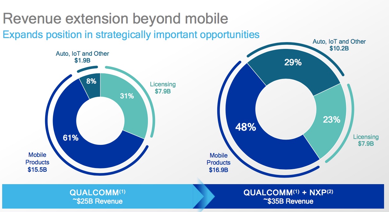L’acquisition de NXP par Qualcomm s’inscrit dans un mouvement global actuel de concentration des sociétés de semi-conducteurs, avec notamment les rachats d’Atmel par Microchip, Broadcom par Avago, Freescale par NXP, Altera par Intel, PMC-Sierra par Microsemi, Linear par Analog Devices, Fairchild par ON Semiconductor ou Intersil par Renesas. Pour sa part, Qualcomm s’était déjà offert ces dernières années Atheros (2011), un spécialiste des circuits de communication Wi-Fi, Wilocity (2014), un pionnier du marché des circuits radio compatibles WiGig, CSR (2015), société bien connue pour ses compétences en technologies Bluetooth, Bluetooth Smart, audio et GNSS, et Ikanos (2015), entreprise incontournable sur le créneau des technologies de réseau d’accès sur paires téléphoniques xDSL et G.fast.