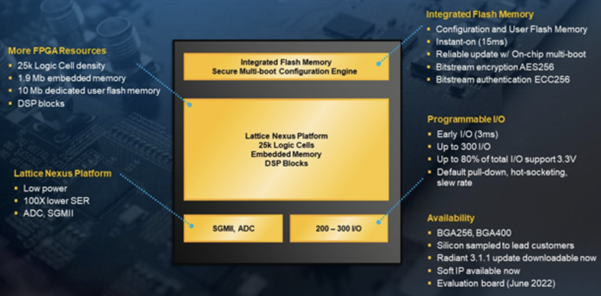 Pour rappel, la plate-forme Nexus tire parti des avantages de la technologie FD-SOI 28 nm (Fully Depleted Silicon On Insulator) pour produire des FPGA dotés de 10 à 200 000 cellules logiques à très faible consommation - jusqu'à 70 % inférieure à celle des FPGA concurrents de classe similaire avec une gestion thermique simplifiée et un coût d'exploitation total optimisé selon Lattice. La plate-forme intègre des blocs DSP optimisés et une capacité mémoire élevée qui permettent des rapports mémoire/logique adaptés aux applications complexes, comme l’intelligence artificielle (IA) embarquée.
