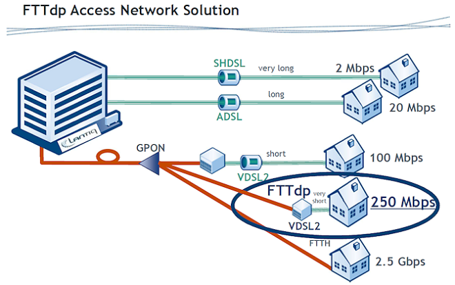Prôné notamment par le Broadband Forum, le FttDP est une architecture de réseaux à très haut débit consistant à déployer de la fibre optique jusqu’à un point proche des logements des abonnés situé à l’extérieur ou à l’intérieur d’un bâtiment résidentiel, puis à réutiliser le câblage téléphonique en cuivre existant sur la partie terminale (une cinquantaine de mètres en général). Avec l’avantage, pour l’utilisateur, d’une installation aussi simple que celle qui prévaut aujourd’hui pour les box ADSL… tout en bénéficiant de débits qui n’ont rien à envier à la fibre optique (grâce au VDSL2 mais aussi au futur G.fast) pour la diffusion de flux vidéo de résolution 4K/8K, les applications de visioconférence, le transfert de gros volumes de données pour stockage dans le cloud, etc.