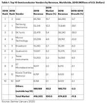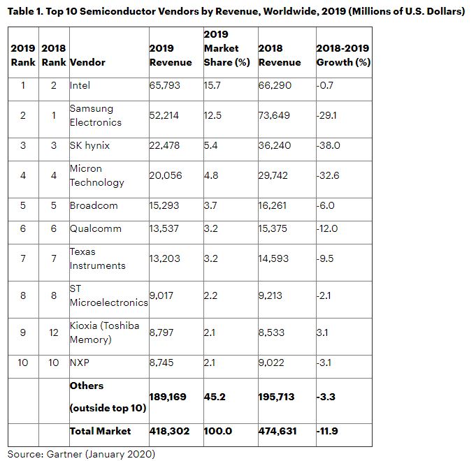 Selon la société d’études Gartner, les ventes de semi-conducteurs ont généré un chiffre d’affaires de 418,3 milliards de dollars en 2019, en baisse de 11,9% par rapport à 2018. Dans le même temps, Intel a récupéré sa place de numéro un, ...le ralentissement du marché des mémoires ayant impacté négativement la plupart des principaux fournisseurs, et particulièrement Samsung Electronics, qui dominait en 2017 et 2018 le secteur des semi-conducteurs.