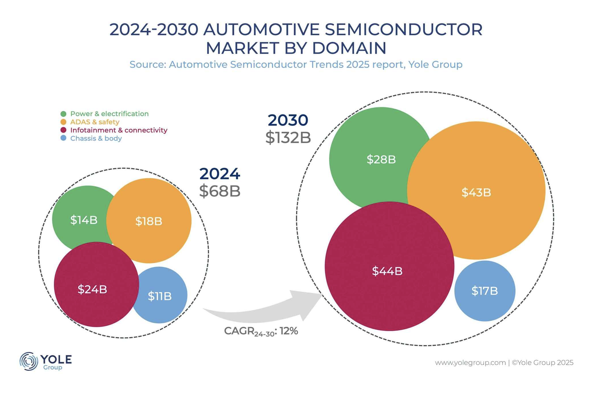 Selon le rapport, alors que le marché automobile mondial connaîtrait une croissance modérée d'environ 2 % entre 2024 et 2030, le marché des semi-conducteurs automobiles, de son côté, pourrait afficher une croissance cinq fois plus rapide, passant de 68 à 132 milliards de dollars.