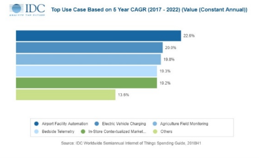 Parmi les autres domaines identifiés qui vont dépenser dans l’IoT, IDC note l'automatisation des installations aéroportuaires, la recharge de véhicules électriques, la surveillance dans l'agriculture, la télémétrie pour les soins de santé à domicile et les activités de marketing dans les magasins.