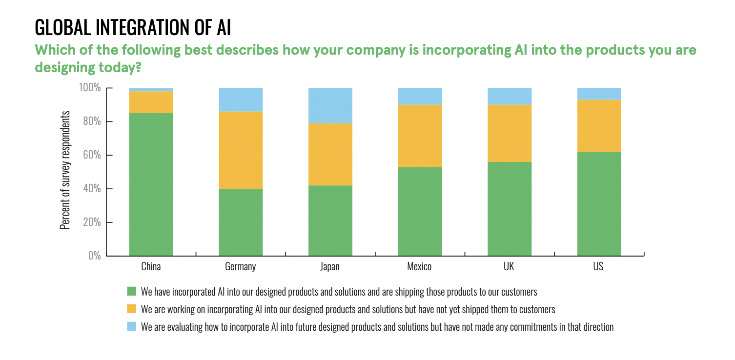 À l’échelle mondiale, plus de la moitié des ingénieurs interrogés (56%) déclarent commercialiser actuellement des produits intégrant l’IA dans leur conception, ce qui représente une augmentation de 33% par rapport à l’année précédente. Les niveaux d’adoption varient selon les régions, reflétant les différentes priorités industrielles, les environnements réglementaires et les cycles de vie de production.