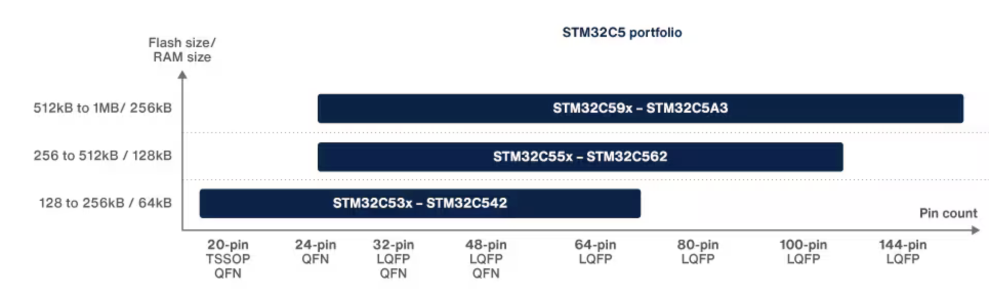 Les microcontrôleurs STM32C5 entrent actuellement en production, avec des boîtiers allant de 3 mm x 3 mm en UFQFPN20 jusqu’au 20 mm x 20 mm en LQFP144.