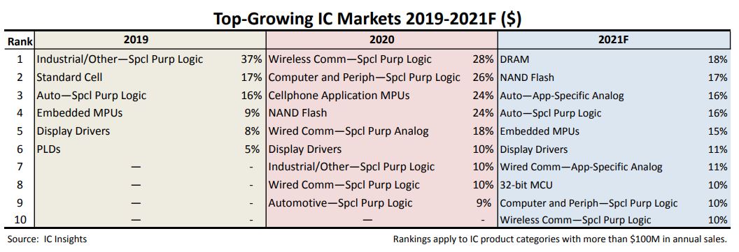 Sans réelle surprise, les mémoires DRam et flash Nand devraient être les deux catégories de circuits intégrés à croître le plus rapidement en 2021, avec une progression des ventes de 18% et 17% respectivement. Alors que l’augmentation des ventes d'ordinateurs portables, de tablettes et de serveurs, liée à la pandémie de Covid-19, a dopé les ventes de mémoires Nand de 24% en 2020, la transition vers la 5G de bon nombre de ces applications informatiques ainsi que des smartphones devrait continuer de stimuler la croissance du marché Nand de 17% en 2021, anticipe IC Insights.