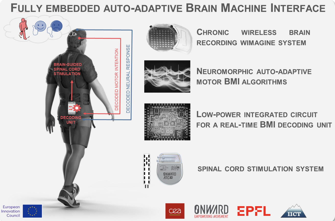 Trophée “Prix spécial du jury” : Le jury a primé le projet NEMO-BMI (Auto-adaptive NEuroMOrphic - Brain-Machine Interface) de CEA-Clinatec. En mai dernier 2023, pour la première fois, une personne paraplégique remarchait en pilotant ses jambes par la pensée. Cette prouesse médicale et technologique avait été rendue possible grâce notamment à une technologie développée par des chercheurs CEA, au sein du centre de recherche Clinatec. Testée aujourd’hui sur des patients tétra ou paraplégiques, cette interface cerveau-ordinateur pourrait être utilisée dans le futur par des patients présentant des troubles de la communication ou encore les victimes d’un AVC, ouvrant de nouveaux horizons en termes d'autonomie pour les personnes handicapées. L’algorithme permet de décoder des signaux cérébraux pour en extraire les intentions de mouvement. Il a été validé lors d’essais cliniques à Clinatec en partenariat avec les CHU de Grenoble et Lausanne et avec l’EPFL.