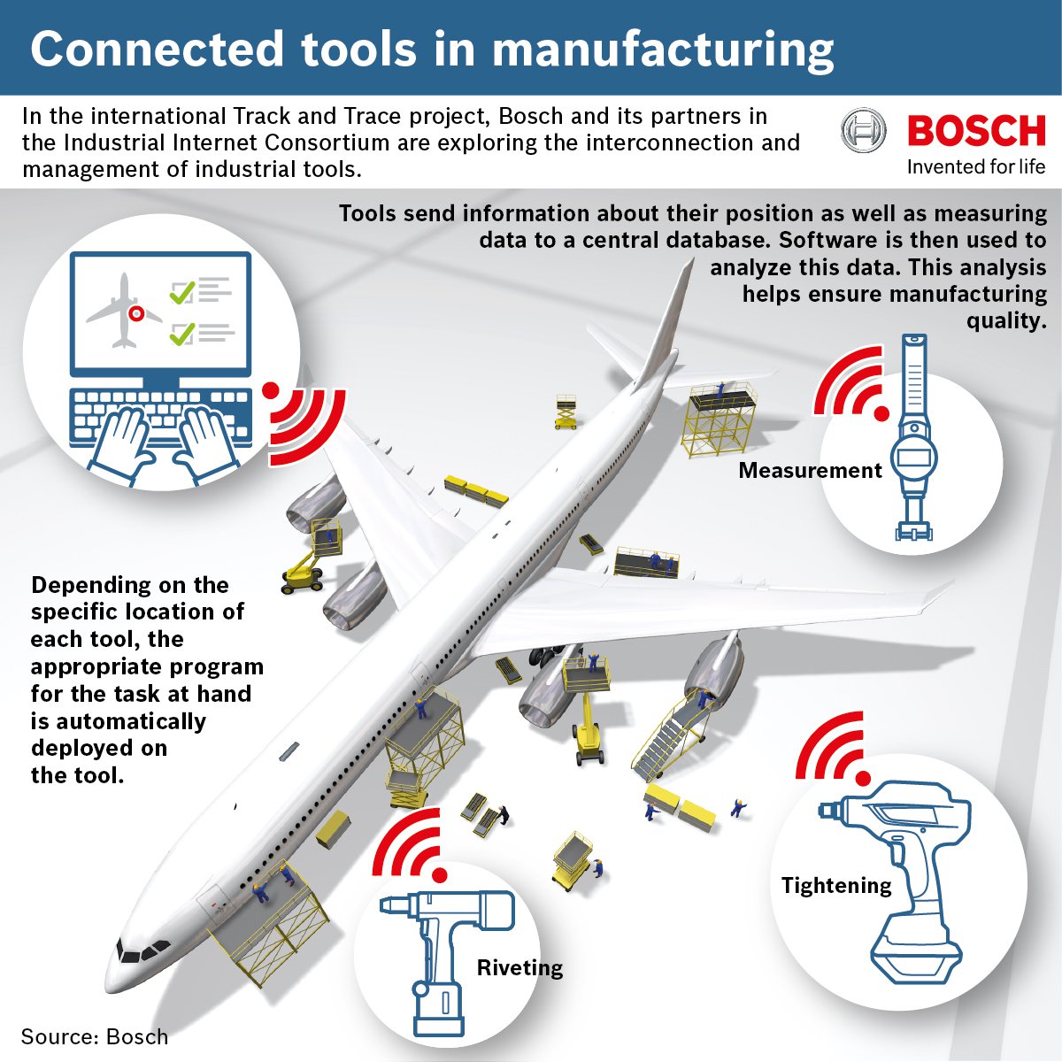 Dans le projet Track and Trace, Bosch va fournir l’infrastructure logicielle, Cisco va s’occuper de la partie identification et localisation des outils, National Instruments se chargera des aspects liés à l’interconnexion entre les outils et l’acquisition de données sur chaque outil, et enfin Tech Mahindra sera le responsable de la programmation de l'application. En somme, il s’agit d’importer et d’adapter les technologies Internet dans une usine, et de réaliser un démonstrateur à l’échelle industrielle sur lequel l’Industrial Internet Consortium (IIC) pourra s’appuyer pour édicter des normes et des recommandations, notamment au niveau des interfaces logicielles des outils de production.