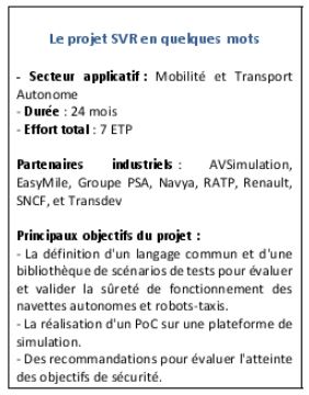 Le projet SVR s'inscrit dans le cadre des activités de l'IRT SystemX en matière de transport autonome, visant à fournir des méthodes et des outils pour la conception et la validation de tels systèmes. Le système de transport autonome, comme défini dans le projet SVR, intègre plusieurs éléments tels que les véhicules (navettes et robot-taxis), l'infrastructure routière, la signalisation, un poste de contrôle centralisé et la communication entre ces acteurs. L'ensemble est sécurisé : chaque élément participant à cette sécurisation doit rester opérationnel dans toutes les circonstances (heure du jour, trafic, météorologie...) durant lesquelles le service doit être assuré. Les scénarios et la simulation mise en œuvre doivent donc couvrir l'ensemble de ces éléments dans toutes les conditions d'utilisation retenues (pluie, brouillard, nuit, etc.).