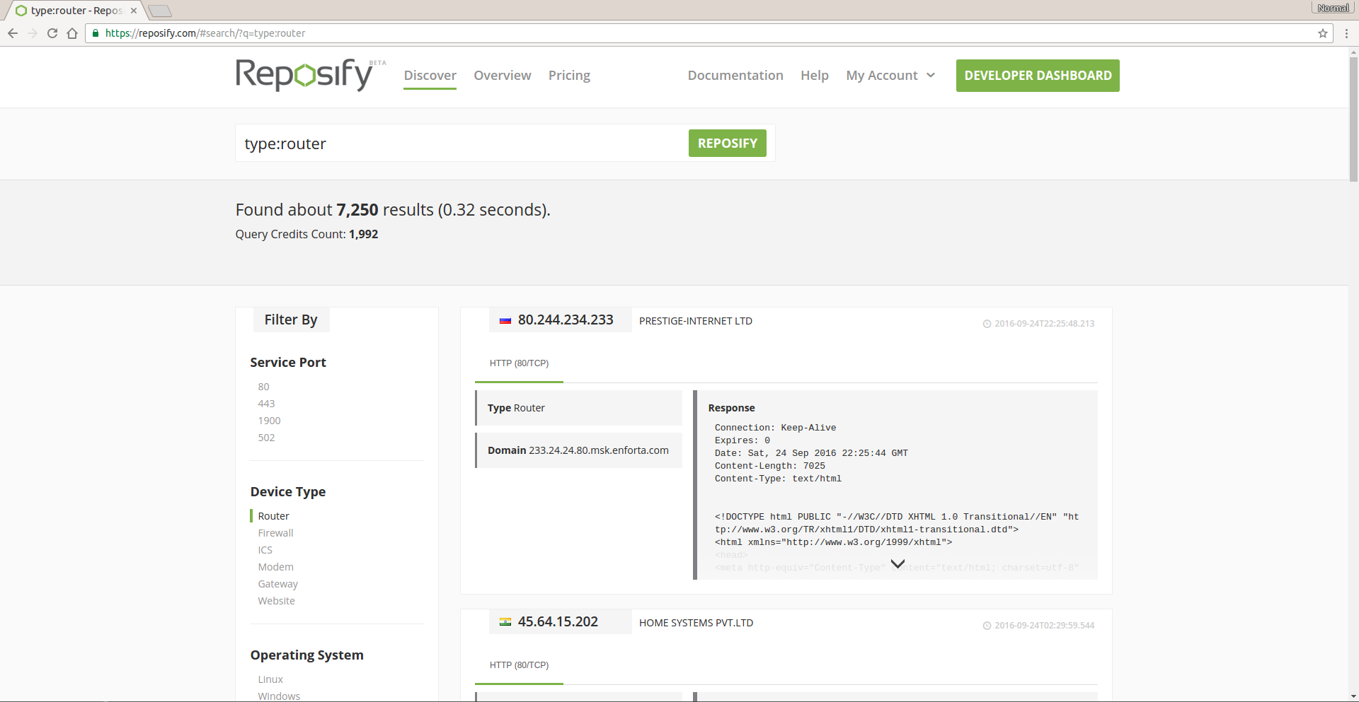 Détecter en un clic de souris tous les capteurs, dispositifs, systèmes et équipements connectés à l'Internet public et offrir un moyen de recherche efficace et rapide de tous ces objets avec leurs caractéristiques ...associées, telle est l’ambition du moteur de recherche développé par la toute jeune société israélienne Reposify (fondée en 2016 et basée à Tel Aviv). La plate-forme proposée par la société, qui commercialise aussi une API permettant aux développeurs d’intégrer les informations récupérées par l'outil dans leurs propres produits, procure une analyse ciblée des systèmes de l’IoT.