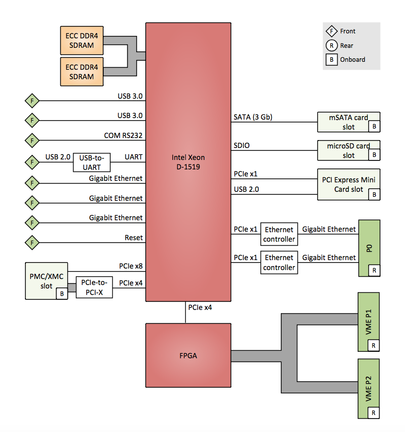Sur la carte VME SBC 25A, utilisable en tant que carte maître ou esclave sur un bus VME 64 bits, on trouve, à côté du processeur, un FPGA en charge de la gestion du bus VME (via une solution en open source), 32 Go de mémoire SRam DDR4 soudée et 16 Mo de flash. En face avant, des interfaces Gigabit Ethernet au nombre de trois, deux ports USB 3.0 et deux ports RS232 classiques sont disponibles. A l'arrière sur le fond de panier, la carte donne accès à 2 liens Gigabit Ethernet supplémentaires.