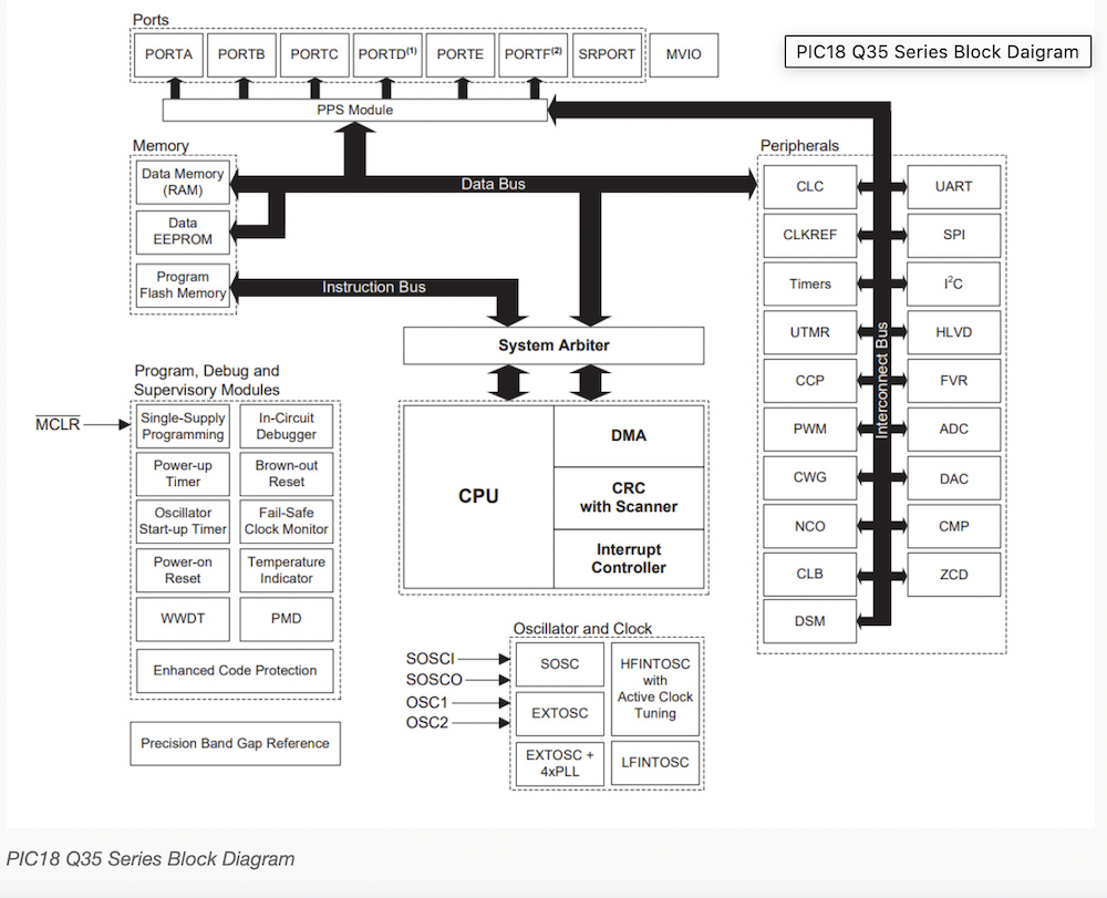 Le PIC18-Q35 est plutôt conçu cibler des applications complexes avec une capacité élevée en éléments  logique (jusqu'à 128) et plusieurs périphériques tels que l'UTMR (Universal Timer) avec un chaînage sur 32 bits), un NCO (Numerically Controlled Oscillator) et le CWG (Complementary Waveform Generator), ce qui rend ce circuit adapté à la commande de moteurs et à la conversion de puissance.