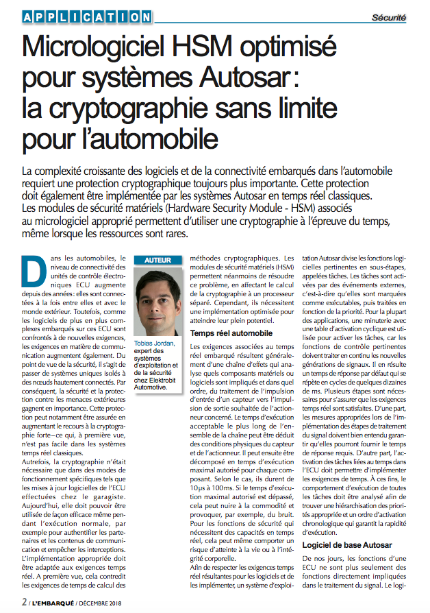 Micrologiciel HSM optimisé pour systèmes Autosar : la cryptographie sans limite pour l’automobile, par Tobias Jordan, expert des systèmes d’exploitation et de la sécurité chez Elektrobit Automotive, un article au format PDF à télécharger ici.
