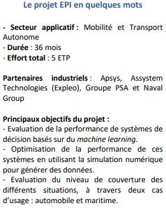 Piloté par l’IRT SystemX, le projet EPI réunit quatre partenaires industriels - Apsys, Expleo Assystem Technologies, Groupe PSA et Naval Group – et s’est donné trois priorités :
