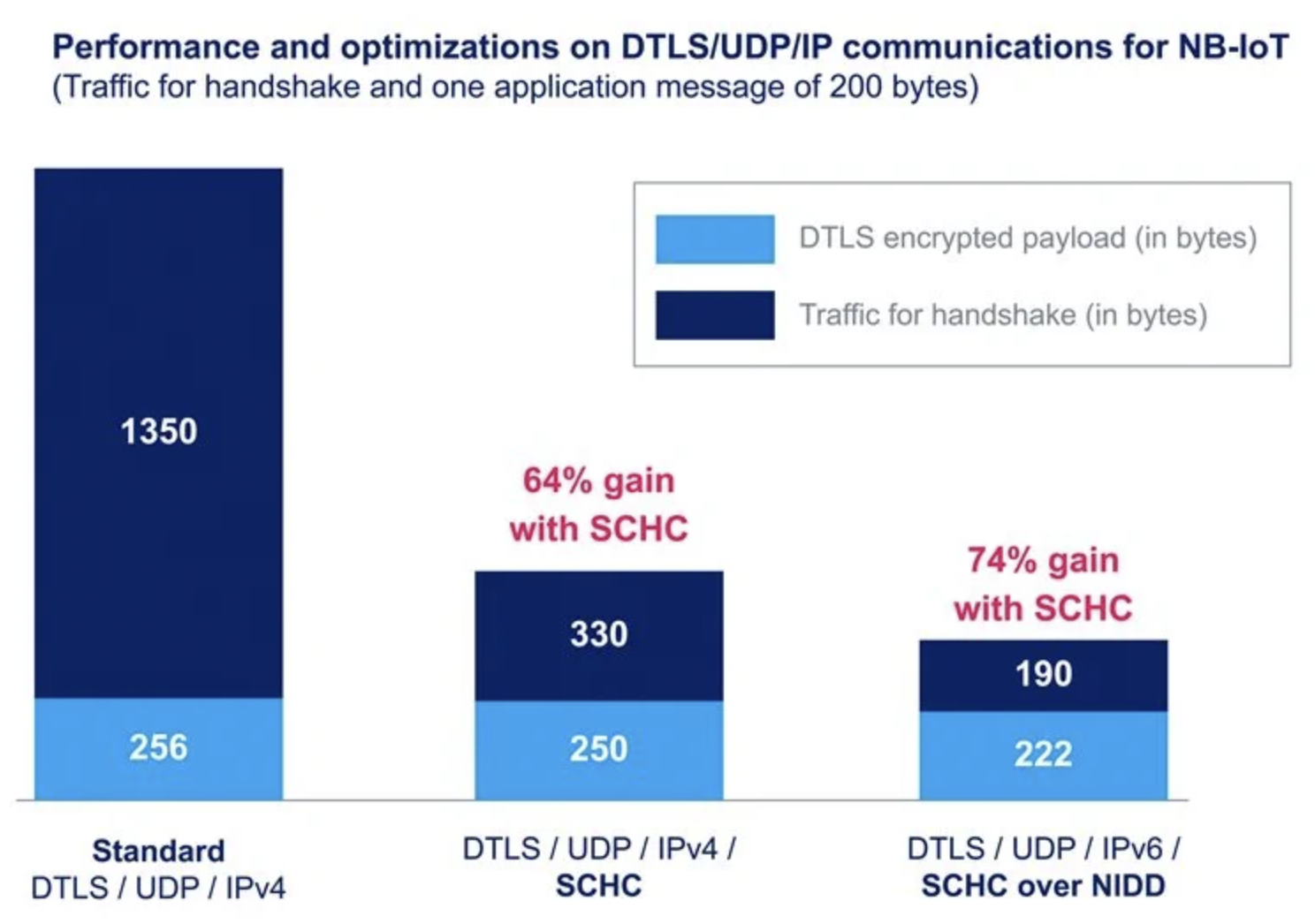 Le NB-IoT, de son côté, est une technologie LPWAN qui réduit le débit et la longueur des paquets de protocole échangés sur les réseaux cellulaires pour atteindre une longue portée et une faible consommation d'énergie. Pour optimiser les performances du NB-IoT, la norme 3GPP Cellular IoT permet à un appareil IoT cellulaire d'éliminer tous les en-têtes IP et d'envoyer uniquement la charge utile des paquets au travers du réseau d'un opérateur. Parallèlement la livraison de données non-IP NIDD est une méthode de communication optionnelle disponible sur un nombre croissant de réseaux NB-IoT qui elle aussi permet de réduire la consommation d’énergie globale d’une liaison.