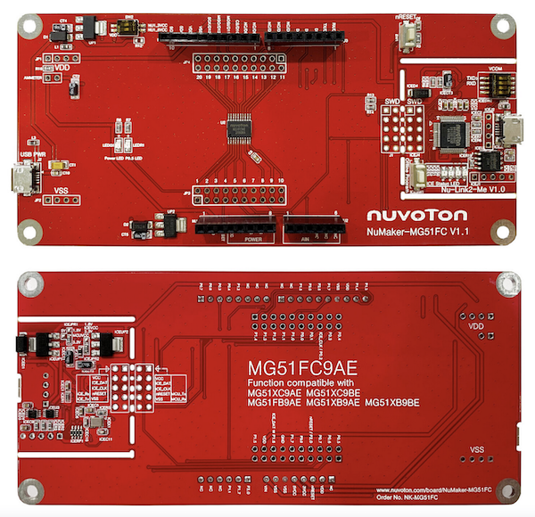 Enfin, Nuvoton propose deux cartes de développement baptisées NuMaker : la NuMaker-MG51FC et la NuMaker-MG51LD. Toutes deux fonctionnent avec un débogueur Nu-Link2-Me intégré, des connecteurs Arduino UNO et deux connecteurs USB. La NuMaker-MG51FC est fondée sur le MG51FC9AE, un boîtier à 20 broches et 18 broches d’entrées/sorties, tandis que la NuMaker-MG51LD est architecturée autour du circuit MG51LD1AE packagé dans un boîtier à 48 broches et 46 entrées/sorties toutes exposées à travers des connecteurs d'extension.