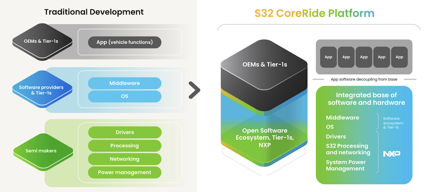 Car, selon NXP, on constate que la prolifération de variantes définies par le matériel dans différentes classes de véhicules est devenue difficile à maintenir dans le flux de développement de l'architecture des véhicules modernes. D’où la mise en œuvre de la plate-forme S32 CoreRide qui vise à surmonter les défis d'intégration logicielle et matérielle qui freinent, selon NXP, l’adoption d’une approche de développement de véhicules définis par logiciel. Avec à la clé la possibilité de mieux déplacer les fonctions d’une architecture multi-ECU traditionnelle vers un traitement zonal ou centralisé, migration jusqu'alors rendue complexe en raison d'incohérences logicielles et architecturales.