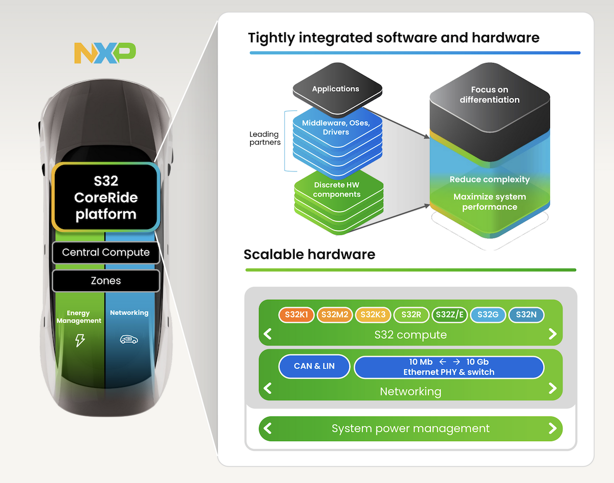Annoncée lors d’une conférence de presse à Munich, l'une des places fortes de l’automobile en Allemagne, la plateforme ouverte S32 CoreRide de la société de semi-conducteurs NXP est présentée par son concepteur comme la première plateforme du secteur automobile que l’on peut voir comme une “superintégration” entre un processeur et une série de logiciels embarqués (systèmes d’exploitation temps réel, hyperviseur, piles logicielles de communication, pilotes…).