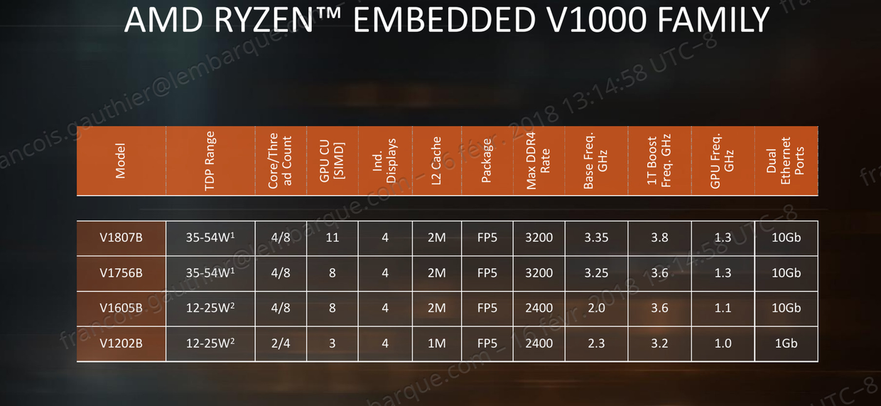 Quant au processeur Ryzen Embedded V1000, il se présente comme un APU (Accelerated Processing Unit) avec un CPU Zen et un GPU Vega étroitement associés sur un seul circuit intégré. Avec jusqu’à 4 cœurs de calcul pour 8 threads et 11 cœurs graphiques associés, offrant alors une puissance de calcul globale de 3,6 téraflops. L'interface mémoire DDR4 à double canal offre quant à elle une vitesse allant jusqu’à 3 200 mégatransferts/s et le TDP s'étage entre 12 W et 54 W. Selon AMD, ces performances sont 200 fois supérieures à celles des précédentes générations. Les entrées/sorties intégrées offrent jusqu’à 16 liens PCI Express, deux canaux 10 Gigabit Ethernet, trois ports USB 3.1 et une interface SATA. Côté pilotage de systèmes graphiques, le processeur peut commander jusqu’à 4 écrans 4K en parallèle, incluant la prise en charge des normes de codage/décodage H.265 et VP9.