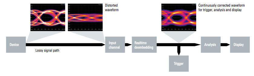 Les oscilloscopes RTP offrent 4, 6 ou 8 GHz de bande passante analogique d’entrée sur quatre voies, avec deux convertisseurs A/N sur 8 bits entrelacés (avec un mode haute définition de 16 bits de résolution, obtenu par calcul). En mode d'acquisition standard, ils permettent la mesure d’un million de formes d'onde par seconde pour une vitesse d’acquisition maximale de 50 Méch./s. Des caractéristiques qui aident les utilisateurs à trouver rapidement des erreurs sporadiques sur un signal analysé, les plus difficiles à détecter car non récurrentes. Sur ces appareils, Rohde & Schwarz a innové en proposant une compensation en temps réel des pertes de transmission de la source du signal vers l'oscilloscope (le de-embedding). Et ce par le biais d’un circuit spécifique (un Asic) qui réalise cette opération (en fait par la mise en œuvre de filtres numériques) avant l’opération de déclenchement sur les signaux, c’est-à-dire avant le trigger numérique installé sur l’instrument. Résultat, il est possible de travailler sur des signaux très “propres” sans se limiter au niveau de la vitesse d’acquisition des signaux. En d’autres termes, l’appareil peut déclencher précisément sur des signaux compensés. En ce sens, il s’agit d’une approche quasi-temps réel, impossible à atteindre lorsqu'on réalise, comme sur la plupart des oscilloscopes, des opérations de post-processing pour corriger les signaux, entraînant des baisses significatives des vitesses d’acquisition.
