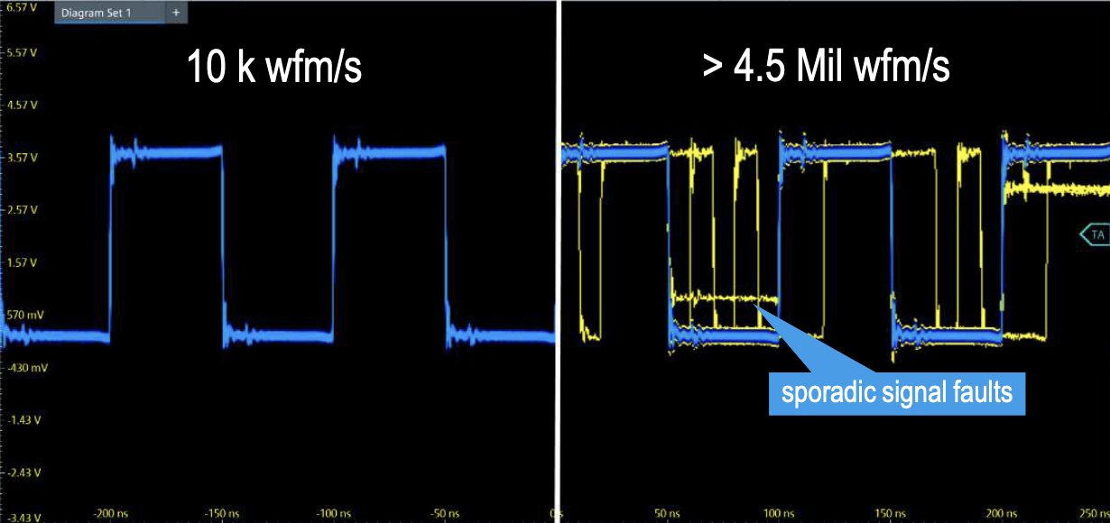 Les performances affichées au niveau du taux de rafraichissement sont directement liées aux performances de l’Asic conçu par Rhode & Schwarz (en technologie 28 nm) et qui est doté d’une capacité interne de de traitement de 200 Gbit/s. Les signaux numérisés étant traités directement par l’Asic, il est possible de révéler et d’isoler sur l’écran de l’oscilloscope des événements peu fréquents, et ainsi mieux comprendre les signaux analysés.