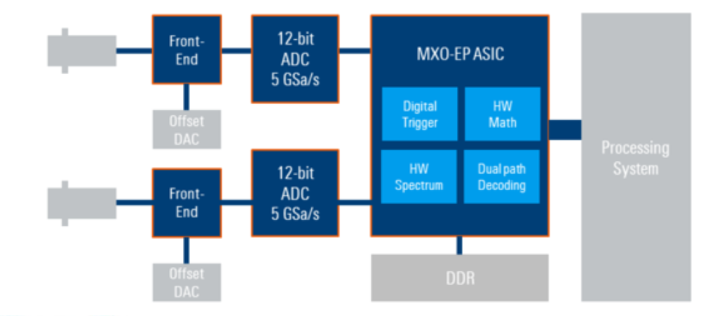 Parallèlement, grâce à l’Asic, l’instrument procure aux développeurs une fonction de déclenchement (trigger) numérique qui était jusqu'alors disponible uniquement sur les oscilloscopes de haut de gamme. La sensibilité affichée de 1/10 000 de division, avec un réarmement inférieur à 21 ns et une gigue de 1 ps, permet là aussi d'isoler des petites anomalies habituellement difficiles à déceler en présence de signaux de forte amplitude. Ce trigger numérique complète l'architecture de numérisation de l’instrument doté de 12 bits de résolution en verticale sur la totalité de la bande passante, résolution que l’on peut porter à 18 bits par calcul.