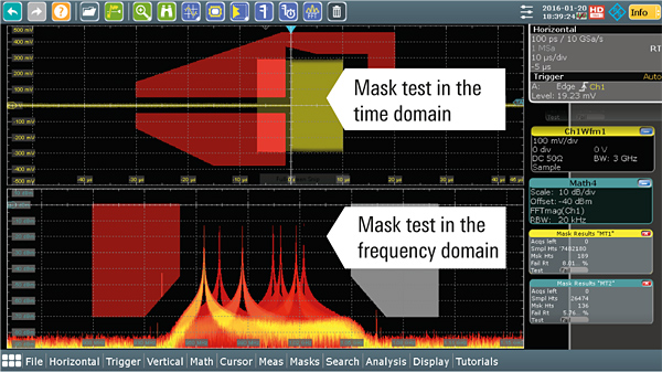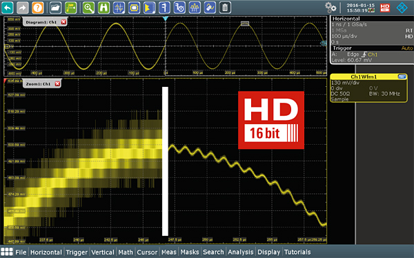 Parallèlement, les mesures de puissance (pour les alimentations), l’étude temporelle synchronisée des signaux numériques issus de processeurs et de capteurs, l’analyse logique des protocoles et l’analyse fréquentielle des signaux (via un analyseur de spectre intégré) sont abordables à partir du même instrument. Doté d’une résolution verticale des signaux sur 16 bits affichés sur un écran couleur de 12,1 pouces, l’oscilloscope est apte à détecter des événements aléatoires ou des détails sur un signal quelconque. Il offre en outre la possibilité d’acquérir jusqu’à un million de formes d’onde par seconde.