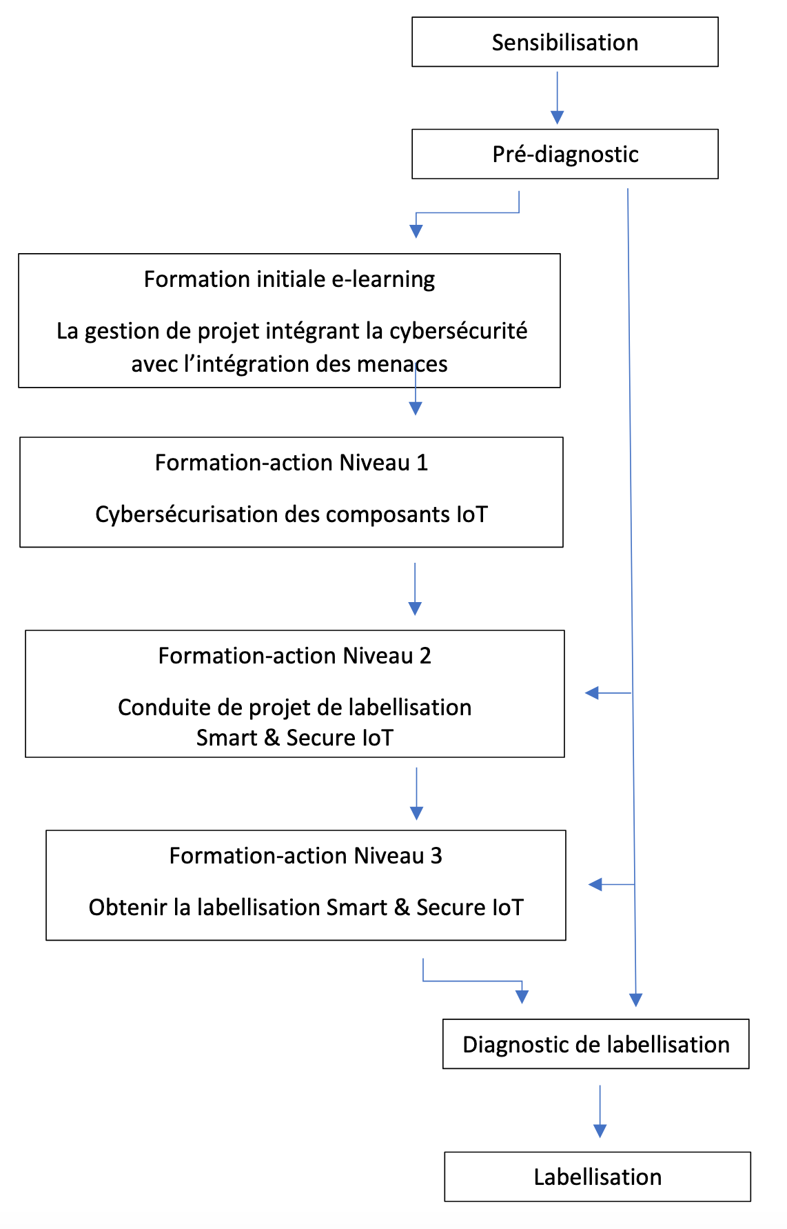 L’entrée dans le dispositif se fait via un prédiagnostic confidentiel d’une journée, afin de faire le point sur le projet porté par l’entreprise. Un rapport est ensuite envoyé au dirigeant, accompagné d’un projet de formation-action en vue d’obtenir le label “Smart & Secure IoT”. Le dispositif est déployé à travers des modules de formation-action en apprentissage mixte (e-learning et présentiel) et collectif, adapté au porteur du projet IoT au sein de l’entreprise. Pour ce processus, la région finance 50% des coûts.