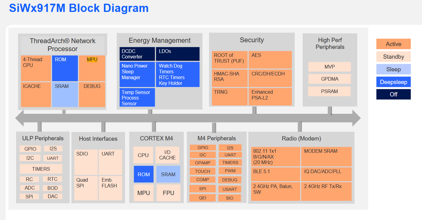 Dans le détail, la puce SiWx917 se déploie sur une architecture à double cœur, avec un cœur de processeur réseau ThreadArch à quatre threads pour la connectivité sans fil et un cœur de microcontrôleur Arm Cortex-M4F pour le traitement des applications utilisateur. Elle intègre également jusqu’à 672 Ko de mémoire SRam et jusqu’à 8 Mo de flash ainsi qu’un accélérateur d’algorithmes d’intelligence artificielle et d’apprentissage automatique (AI/ML), du nom de MVP. On y trouve aussi un moteur de sécurité amélioré certifiable selon le standard PSA Level 2 et un sous-système de gestion de l'alimentation, le tout dans un boîtier de 7 x 7 mm.
