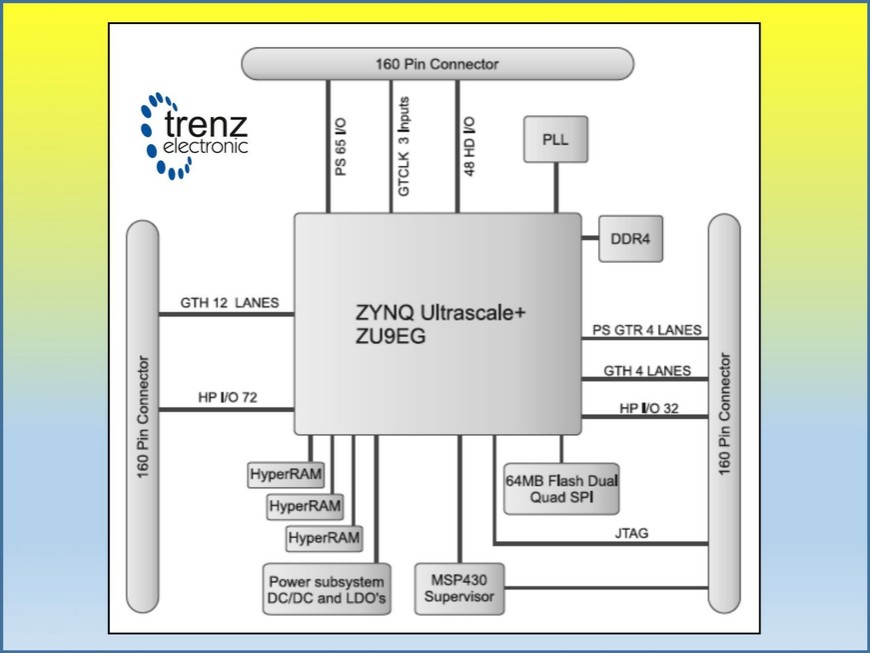 Le circuit MPSoC est flanqué de 4 Go de mémoire 32 bits SDRam DDR4 et de 512 Mo de flash. 14 convertisseurs DC-DC et 13 régulateurs LDO (low-dropout) contrôlés par un microcontrôleur sont en outre disponibles sur la carte. Trois connecteurs de 160 broches chacun (soit 480 au total) supportent des E/S rapides vers la logique du FPGA et les sous-systèmes processeurs. Enfin, une PLL (boucle à verrouillage de phase) dotée dune gigue très faible (ultra low jitter) gère les signaux d’horloge des 20 transceivers série disponibles.