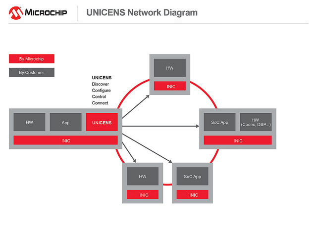 « En substance, Unicens et les contrôleurs INIC fournissent à l’utilisateur la méthodologie de contrôle/commande d’un réseau de type Ethernet sans qu'il ait à se confronter aux défis que pose la gestion d’un protocole de réservation de bande passante pour les données audio et vidéo, précise Dan Termer, vice-président de la division Automobile de Microchip. L’utilisation d’Unicens évite par ailleurs la présence d’un microcontrôleur et d’un logiciel de gestion dans tous les nœuds d’un réseau et garantit ainsi un coût moins élevé et un temps de mise sur le marché réduit. En quelque sorte, Unicens tire profit des avantages respectifs des mondes Ethernet et Most. » Les utilisateurs peuvent en pratique dès aujourd’hui s’appuyer sur des API logicielles standard (telles qu’open, read, write) et sur un protocole de contrôle/commande Ethernet avec le logiciel gratuit Unicens et les contrôleurs INIC Most de Microchip.