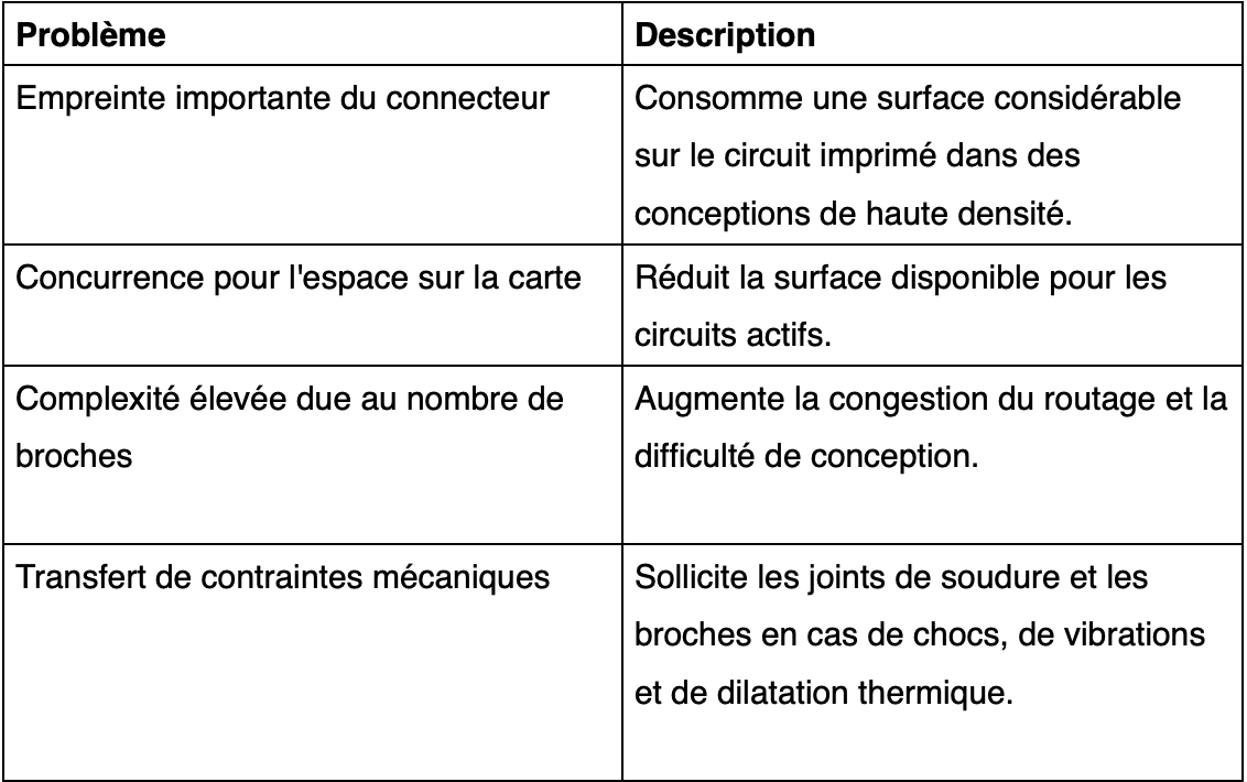 Avec la miniaturisation croissante des composants électroniques, les connecteurs deviennent souvent l'un des éléments les plus volumineux du circuit imprimé, entrant en concurrence avec les circuits actifs pour un espace limité. Un nombre élevé de broches complique le routage, et les contraintes mécaniques dues aux chocs, aux vibrations et à la dilatation thermique sollicitent davantage les joints de soudure et les broches du connecteur.
