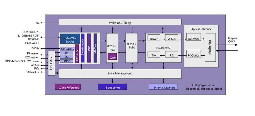 L'émetteur-récepteur KD7251 prend ici en charge les couches physiques BASE-AU pour des débits de données de 2,5; 5 et 10 Gigabit/s sur des liaisons par fibre optique. Il relie les capteurs MIPI de caméras (CSI-2), des écrans (DSI-2) et des processeurs en charge du déroulé d’applications d’intelligence artificielle (IA).