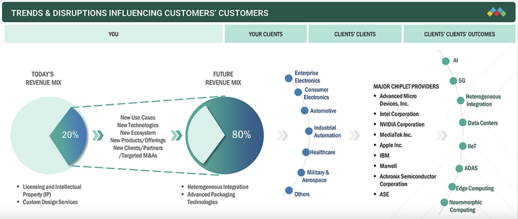 Sur ce marché, la socité d'étude indique qu’à ce jour les principaux acteurs sont les sociétés américaine Intel, AMD, Apple, IBM, Achronix Semiconductor, Nvidia et Marvell, ainsi que les taïwanais MediaTek et ASE Technology, et le canadien Ranovus.