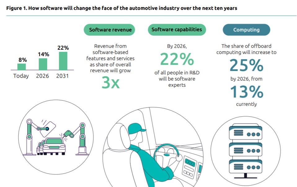Selon un récent rapport du Capgemini Research Institute, la transformation tirée par le logiciel que connaît actuellement le secteur automobile va, dans les dix ans qui viennent, plus que tripler le chiffre d’affaires réalisé par les constructeurs automobiles dans le domaine du logiciel. ...Actuellement de 8% (181 milliards de dollars), la part du logiciel et des services dans leur CA global devrait passer à 22% (640 Md$) d’ici à 2031.