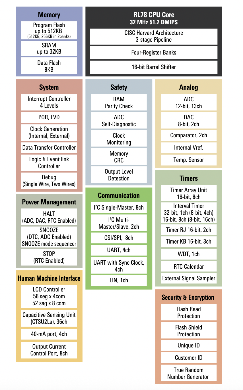 Ces circuits RL78/L23 sont optimisés pour une consommation d'énergie ultra-faible et adaptés aux applications alimentées par batterie qui passent la majeure partie de leur temps en veille. Ils affichent un courant actif de seulement 109 μA/MHz et un courant de veille aussi bas que 0,365 μA, ainsi qu'un temps de réveil rapide de 1 μs, l’idée étant de minimiser au maximum l'activité du processeur central.