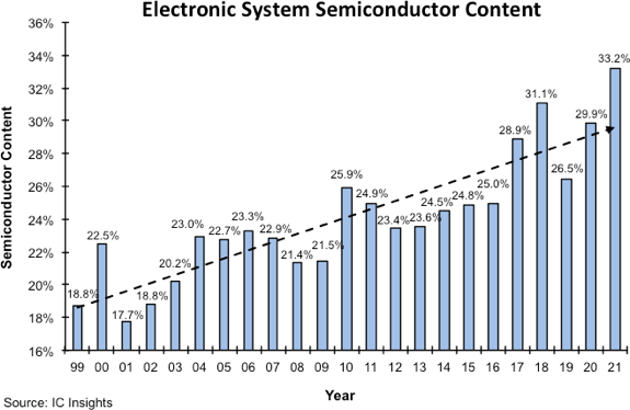 Historiquement, la progression annuelle moyenne de l'industrie des semi-conducteurs est plus élevée que celle du marché des systèmes électroniques. La raison en est due à l’augmentation irrépressible de la valeur ou du contenu des semi-conducteurs intégrés dans ces systèmes électroniques. Une tendance mise en évidence par la société d’études IC Insights.