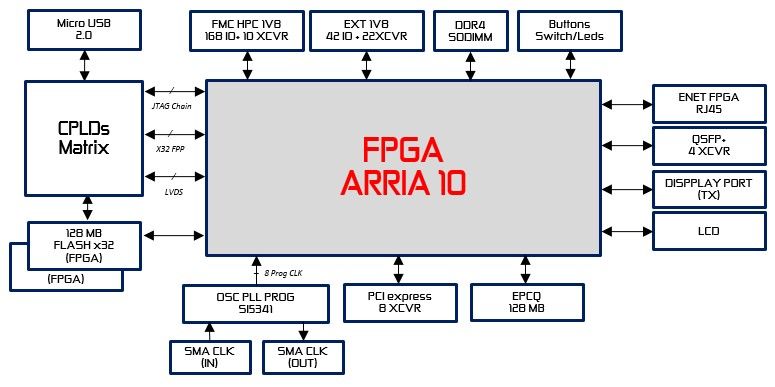 Préannoncée lors du dernier salon Embedded World, cette plate-forme de développement et de prototypage pour des applications haut de gamme (traitement de signaux vidéo, communications rapides, systèmes militaires…) intègre un FPGA Arria 10 GX (modèle 570 KLE, packaging F40) associé à huit liens PCI Express Gen 3 à 8 Gbit/s chacun et une interface Ethernet 10/100/1000 Mbit/s sur un connecteur RJ45. Via une cage QSFP+, quatre liens série vers l’extérieur, à 12,5 Gbit/s chacun, sont disponibles. Côté stockage, on trouve une mémoire Sodimm DDR4 de 16 Go, 128 Mo de flash et 32 Ko d’EEprom.