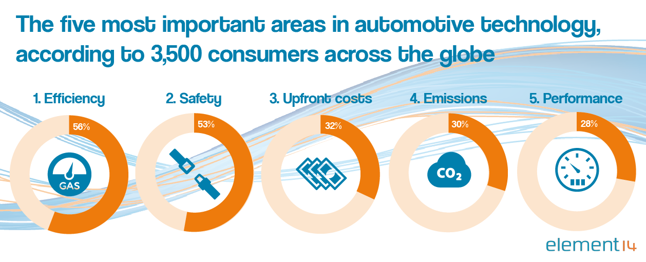 element14, la communauté de développeurs du distributeur Farnell, a réalisé une étude portant sur les attentes des automobilistes vis-à-vis de leur véhicule pour les années qui viennent. Menée auprès de 3 500 personnes en Europe ...(France, Allemagne, Royaume-Uni), Amérique du Nord, Chine, Australie, et Inde, cette enquête montre que l’efficacité (ou le rendement) énergétique, en d’autres termes la consommation, ainsi que la sécurité sont au cœur des préoccupations des usagers, avec respectivement 56% et 53% du panel qui placent ces deux items en tête. On trouve ensuite le coût d’achat initial (32%), les émissions de CO2 (30%, que l’on peut d’ailleurs rattacher à l’efficacité énergétique) et les performances, qui demeurent importantes pour 28% des répondants.